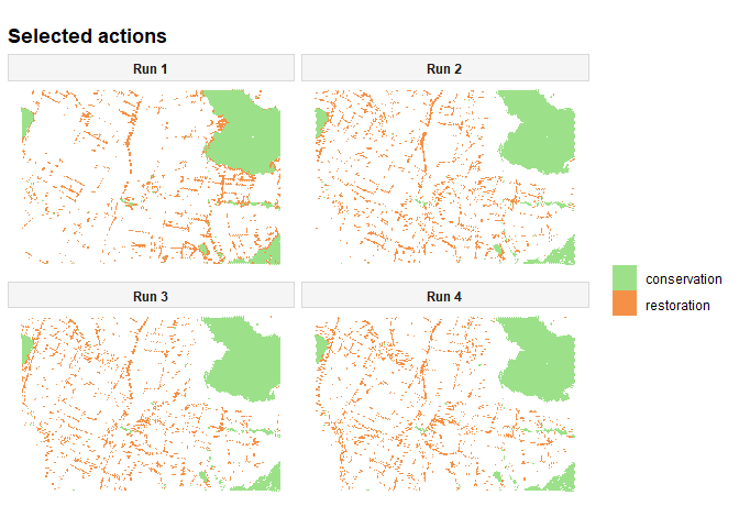 This means that, in this README example, the difference between the two actions comes mainly from where they are eligible and how much they cost, rather than from different ecological effect strengths. In a more realistic application, one would often use different multipliers by action and feature, for example making restoration stronger for some features and weaker, neutral, or even negative for others.