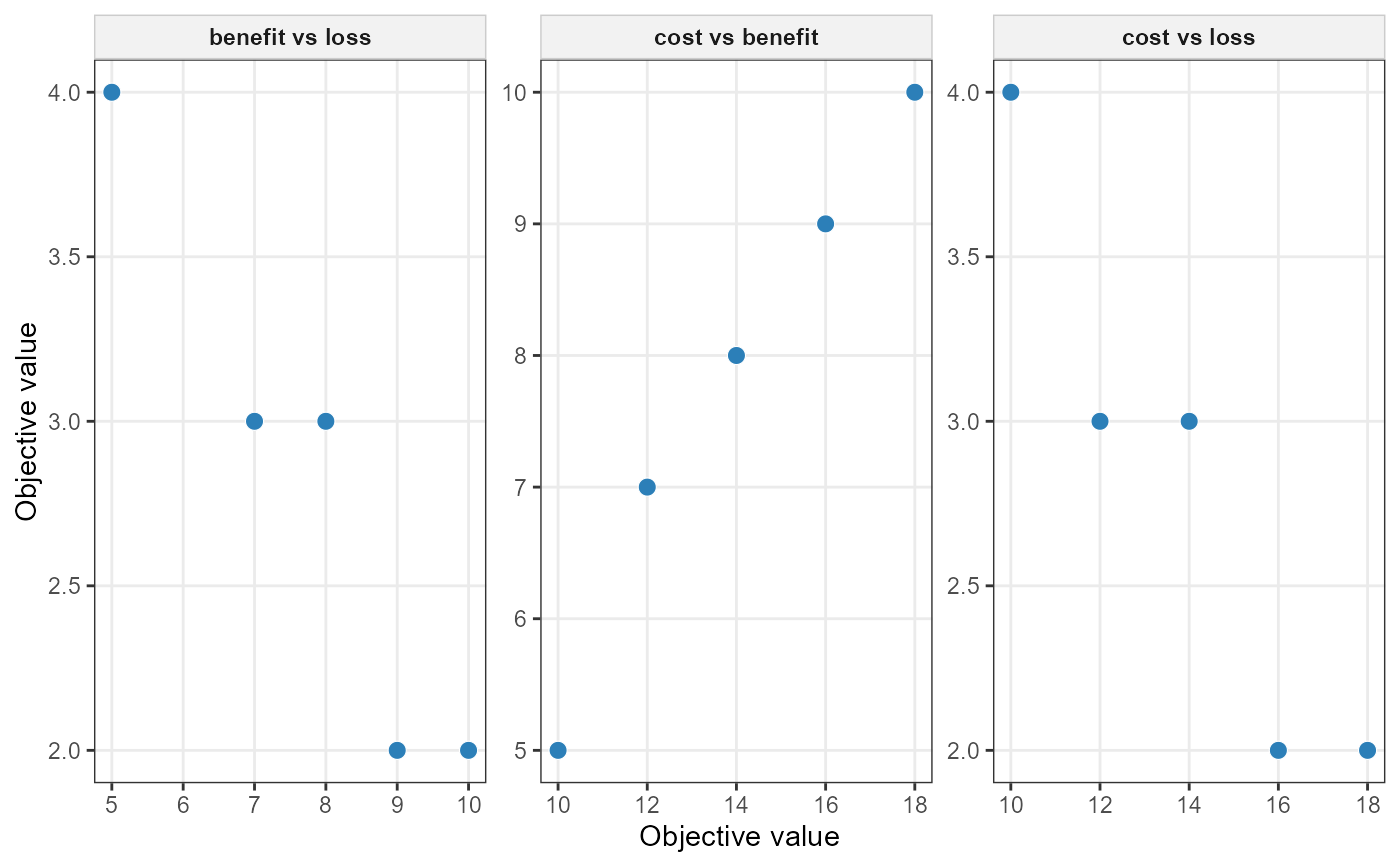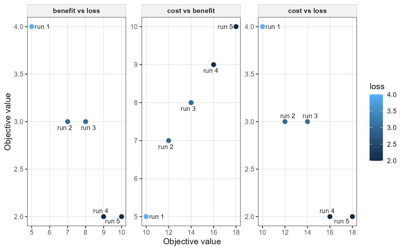 If exactly two objectives are selected, the function returns a single scatterplot. If three or more objectives are selected, all pairwise combinations are plotted using facets.